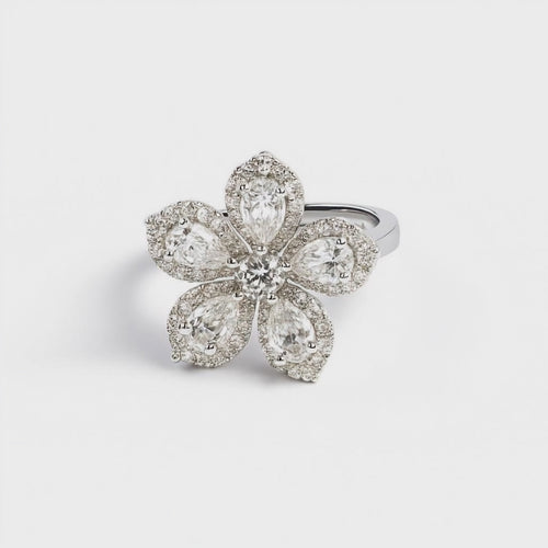 Discover the allure of refined elegance with our Diamond Floral Ring, a masterpiece of modern luxury jewellery. A stunning floral ring set with pear and brilliant-cut diamonds, designed to sparkle with every movement.