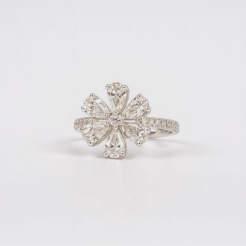 Inspired by the beauty of nature, The Bloom Collection celebrates lovers of flora and fauna with this exquisite single-motif diamond ring. Crafted with a delicate artistry, the design features a harmonious arrangement of pear-cut diamonds forming delicate petals and brilliant-cut diamonds, capturing the organic elegance of a beautiful blooming flower. Each diamond sparkles with radiant fire, creating a timeless symbol of natural beauty and refined sophistication. Perfectly balancing artistry and luxury, this piece is as enchanting as the inspiration behind it.